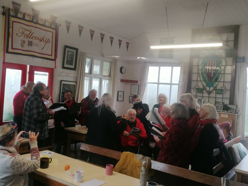 Friday 22nd November at Unity Hall, Nelson. We sang before the performance of The Ragged Trousered Philanthropist, adapted and performed by Neil Gore. A brilliant and packed event in spite of icy streets and slithering cars.
